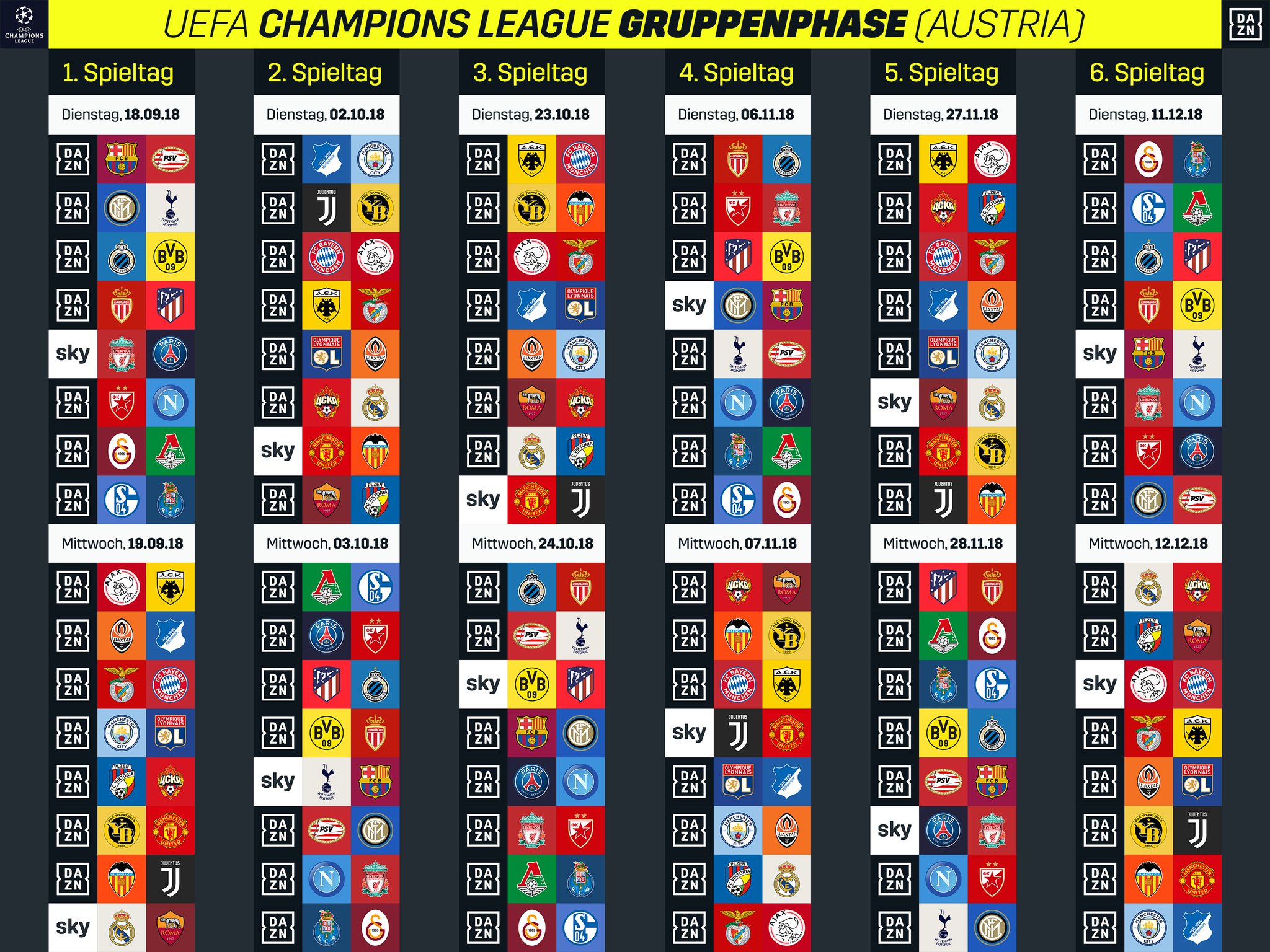 Champions League. SKY und DAZN haben nach der Champions League-Gruppenauslosung die Spiele verteilt. Grosso modo hat SKY an (fast) jedem Sendetag zwei(!) First Picks und die Konferenz, während DAZN sieben Einzelspiele eines Tages live zeigen kann und das andere ab Mitternacht on demand (ebenso wie SKY die DAZN-Spiele ab Mitternacht zeigen kann).